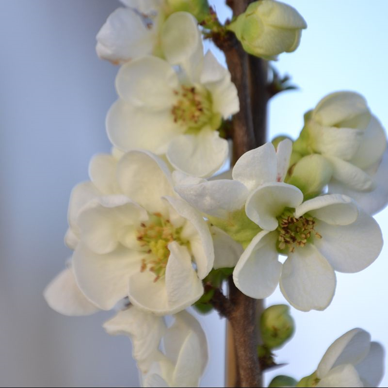 Genus Chaenomeles are deciduous, usually spiny shrubs with simple leaves and cup-shaped, 5-petalled flowers, solitary or clustered, in spring, followed by edible often fragrant green or yellow fruits Details ‘Jet Trail’ is a compact, spreading shrub to 1m tall and 1.2m wide with glossy oval to oblong leaves. 3L