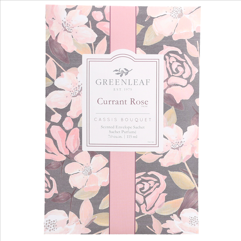 Currant Rose floods the senses with ripened cranberry followed by a floral infundation of rose, geranium, and jasmine. Troubles melt away as you take in this scent which finishes with an earthy sweet balm of vetiver, tobacco, and honey droplets. The envelope sachet has been Greenleaf signature product for over 35 years! Our sachets use specially blended oils that are encapsulated for maximum strength and product life. Add a touch of fragrance anywhere by slipping sachets into closets, drawers, gifts, cars, and more.