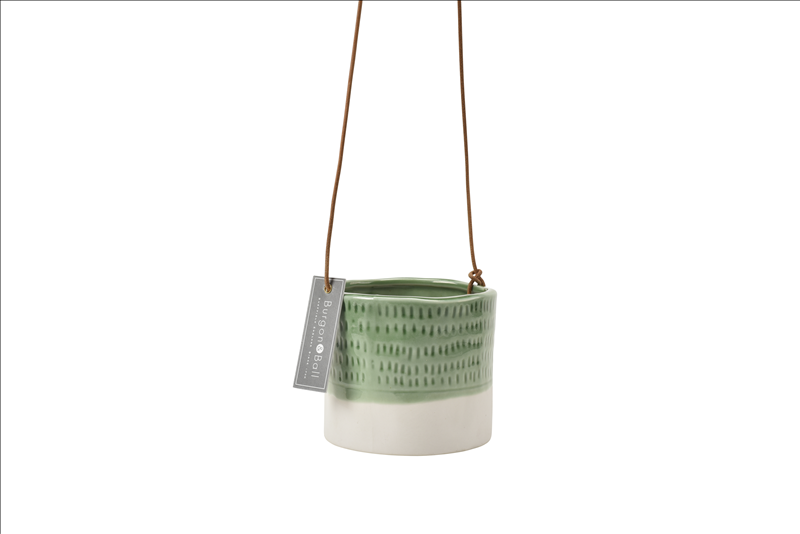 This hanging indoor planter is crafted in durable stoneware, and is fully waterproof. It features a stylish and strong leather hanging cord.