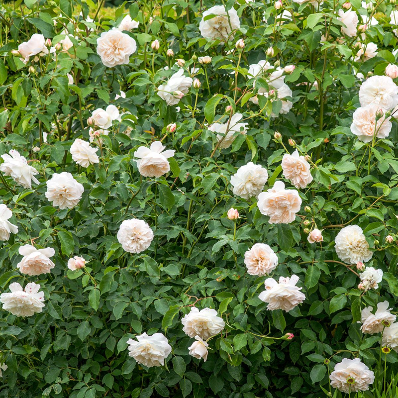 Lichfield Angel is a David Austin rose that is named after an 8th century limestone sculptured panel which was discovered in Lichfield Cathedral. Pale peachy pink buds gradually open to form neatly cupped, cream rosettes. Each bloom of this rose bush has a perfect ring of waxy petals enclosing numerous smaller petals. Eventually the petals turn back to form a large, domed flower. The blooms have a light clove fragrance and are nodding attractively on the branch. Almost without thorns, this is a vigorous, rounded shrub.