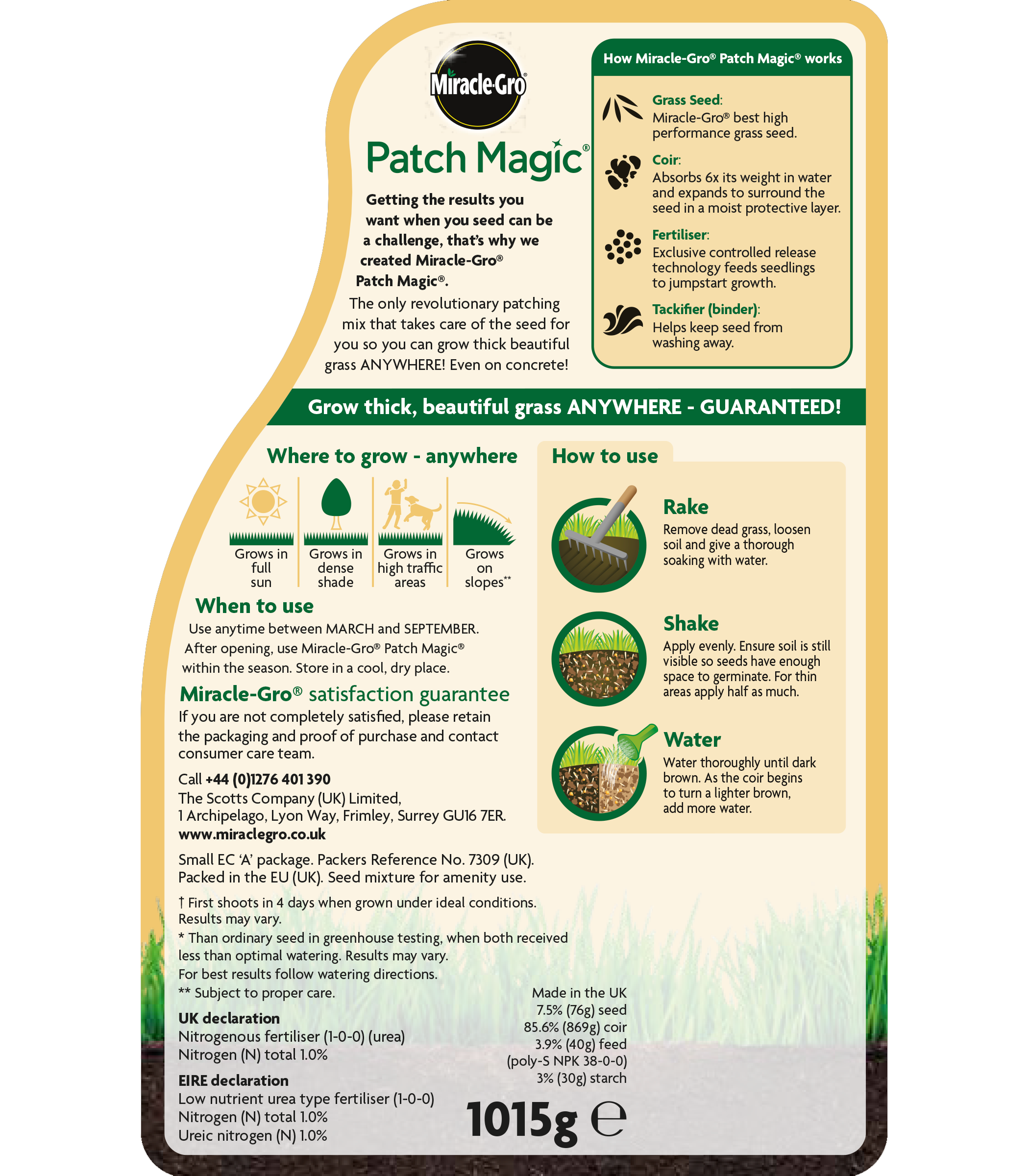 • Unique 3 in 1 patching mix containing seed, feed and coir