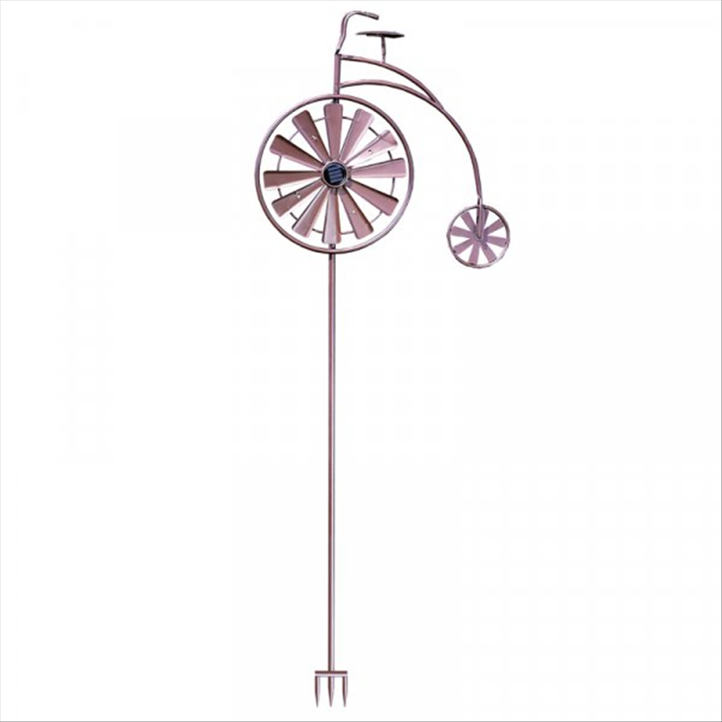 Garden wind spinner with rotating wheel with four white LEDs illuminate to highlight the spinner at night.