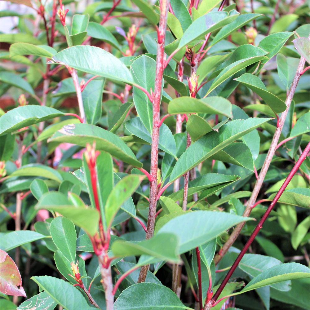 Photinia can be evergreen or deciduous shrubs or trees, with simple leaves and panicles of small white flowers, usually followed by red berries ‘Carré Rouge’ is a compact, erect, evergreen shrub to 2.5m tall, with glossy, lanceolate leaves, brilliant red when young, later turning dark green.
