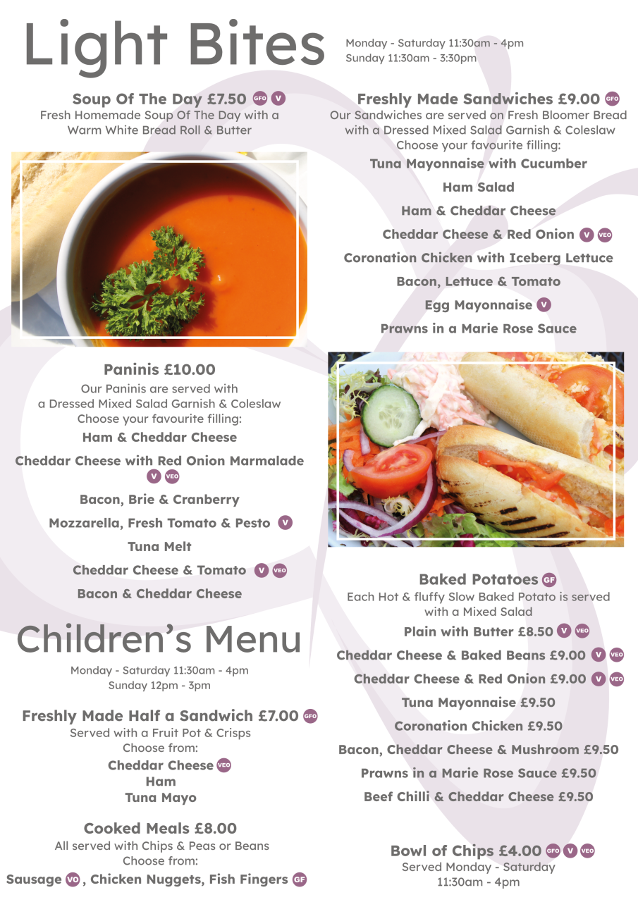 We have a daily specials board with a selection of mouth-watering lunches, as well as our appetising menus, which cover a range of food, including breakfast and light bites.